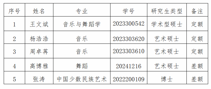 根据《陕西师范大学研究生国家奖学金评选办法》精神,按照《音乐学院2025年研究生国家奖学金评选工作实施细则》,经学生申请、资格审查、评选委员会评议,拟推荐王文斌等3名研究生获国家奖学金,拟推荐高博雅等2名研究生参与学校差额评选。现将名单公示如下: